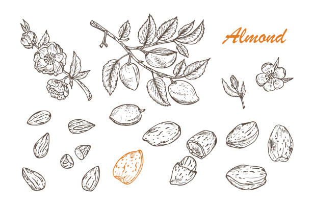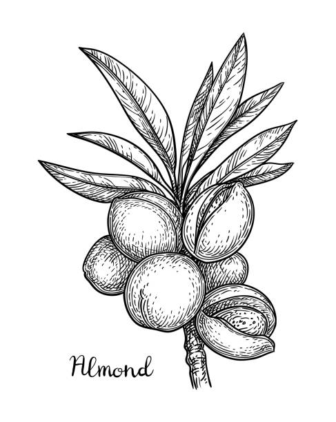 Hand Drawn Graphic Of Almonds And Almond Tree Branch Stock Photo