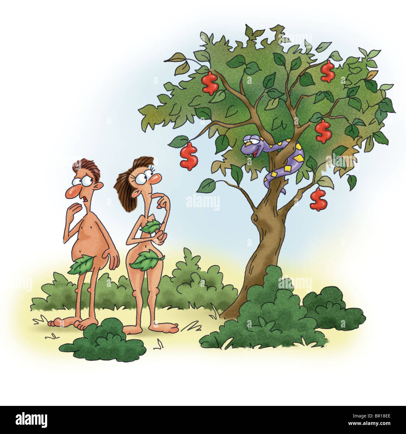 Adam And Eve Looking At A Snake On A Tree Bearing Dollar Fruits